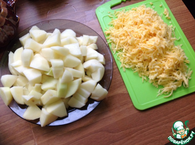 Картошку почистили и режем кубиками средними, сыр трем на крупной терке