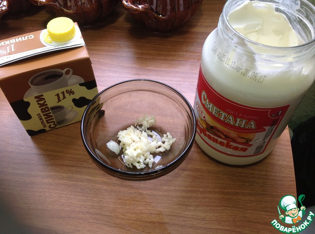 Чеснок выдавливаем, подготавливаем сметану и сливки