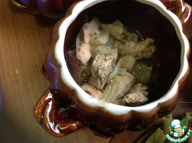 У меня 6 горшков, в каждый выкладываем мясо и бульон
