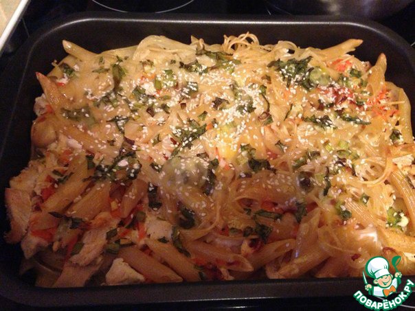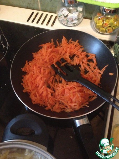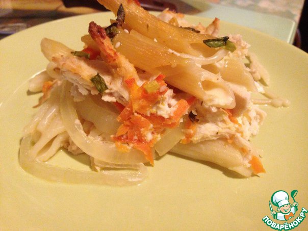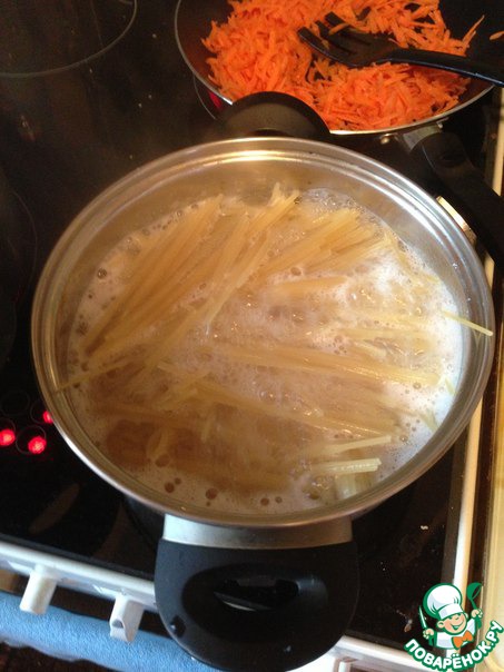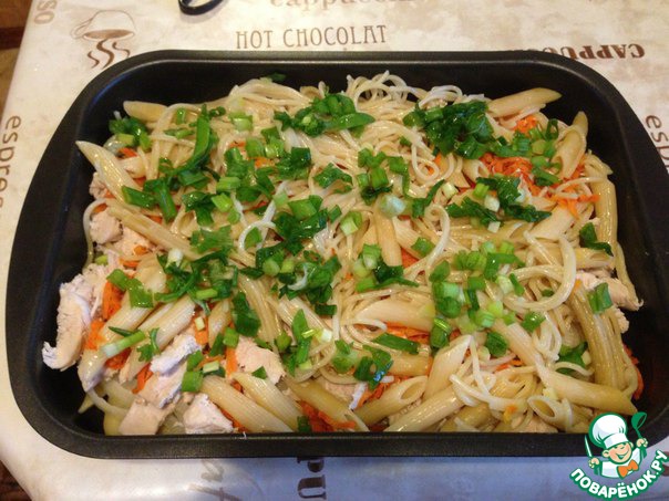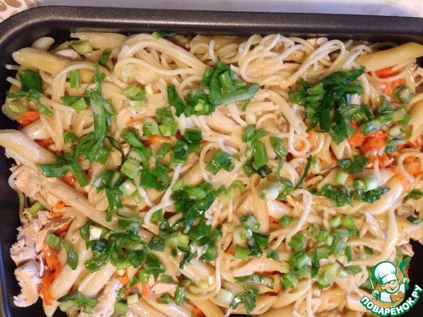 Далее идет морковка и вторая часть макаронных изделий. Можно посыпать сверху зеленым луком.