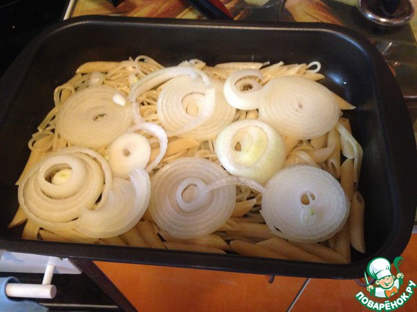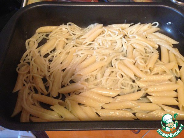После того как макароны сварились, половину выкладываем в форму, смазанную маслом.