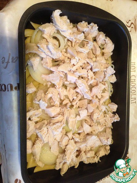 Поставить в духовку примерно минут на 10 при температуре 200 градусов. По истечении времени выливаем туда бульон от нашей курочки. Немного. Ставим еще минут на 20.