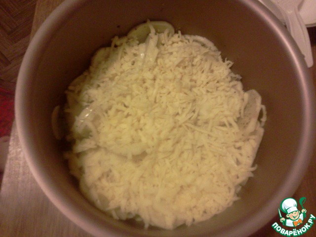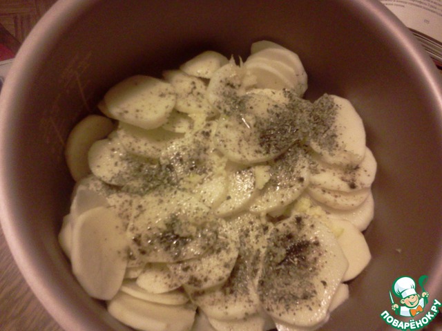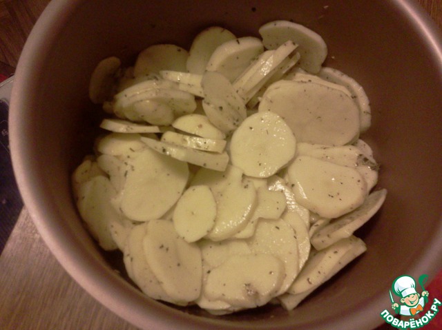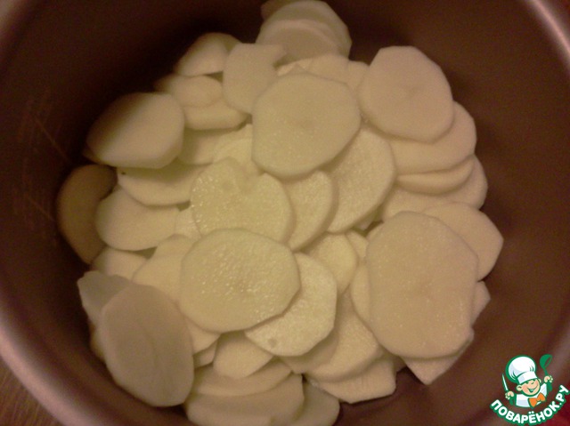 Картофель нарезать тонкими кружочками и выложить в чашу мультиварки.