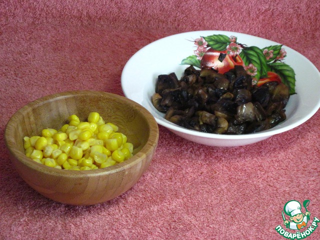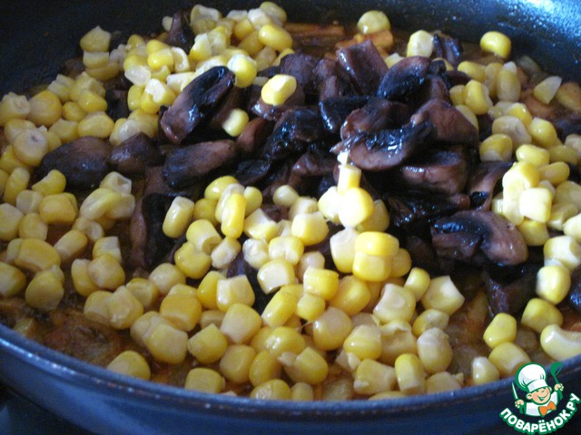 Обжарить грибы до готовности. Слить жидкость из кукурузы. Смешать их вместе посолить и обжарить на сильном огне в течениe 2 минут.