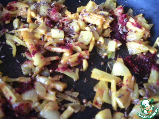 К луку, чесноку и другим приправам добавить зиру, красный перец.