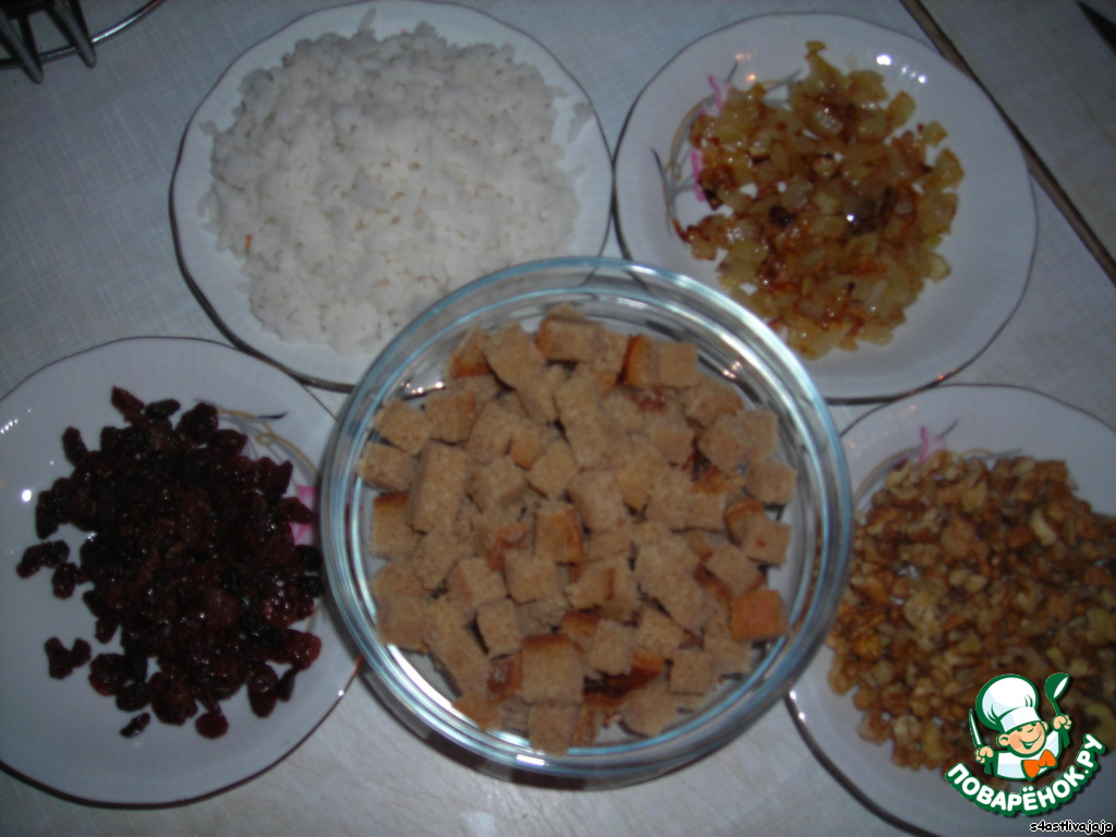 Смешать лук, кусочки хлеба, рис, базилик, розмарин, петрушку, 1/2 ст.л. соли и перец, добавить изюм, орехи и бульон, аккуратно перемешать.