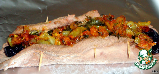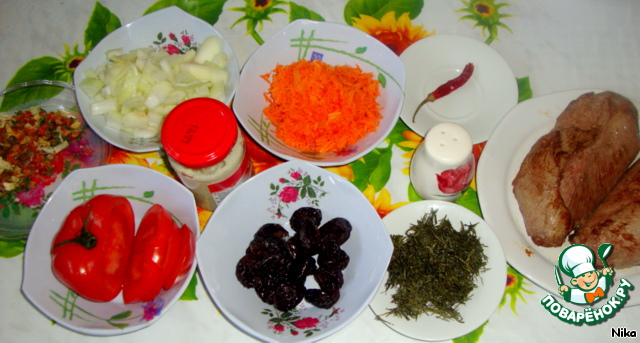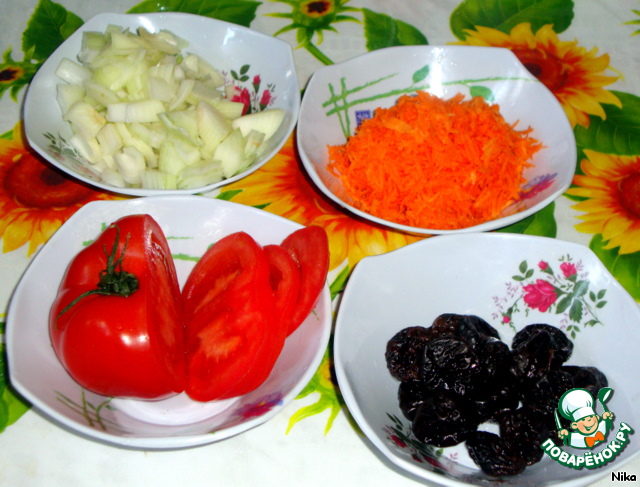 Утка, помидор, лук, хрен, чернослив, морковь, укроп, соль, перец, сухие овощи