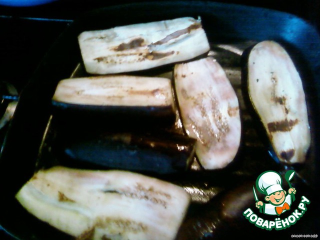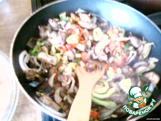 Баклажаны слегка посолилть, отжать. Обжарить на гриле. Затем порезать их соломкой и добавить к сердечкам. Продолжать обжаривать.