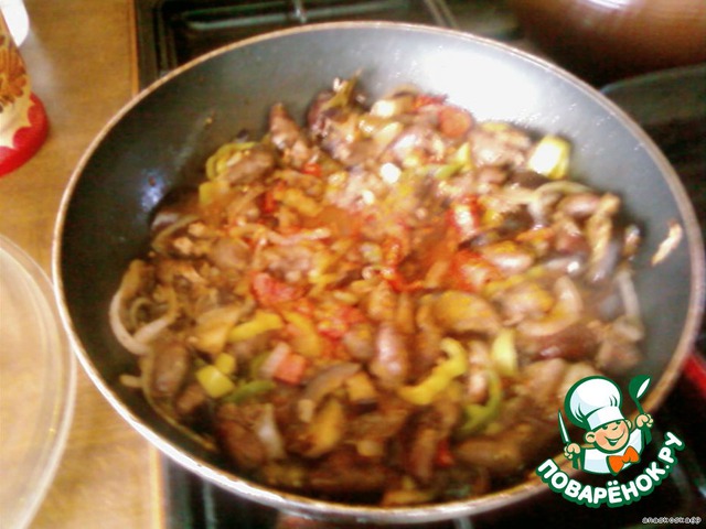 Обжарить сердечки в растительном масле и добавить лук полукольцами.