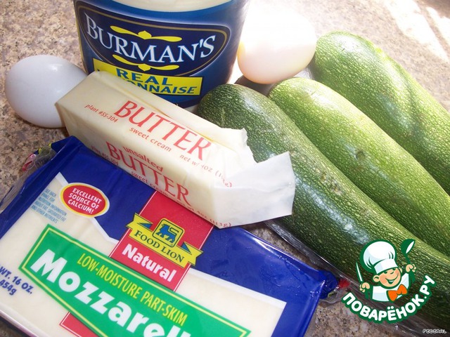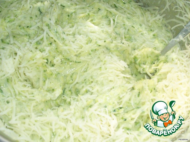 цуккини натереть на тёрке, посолить, поперчить, добавить майонез, яйца, перемешать.