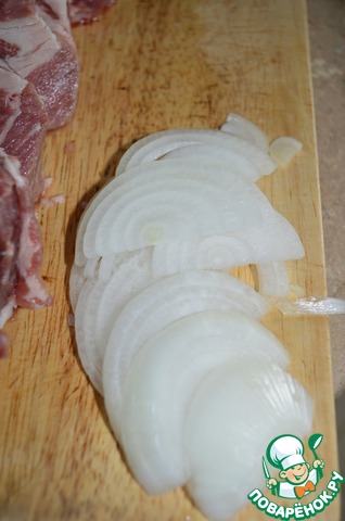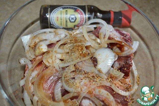 Лук и мясо сложить в стеклянную или эмалированную посуду, добавить соевый соус, бальзамик и остальные ингредиенты. Перемешать и оставить мариноваться на 2-3 часа.