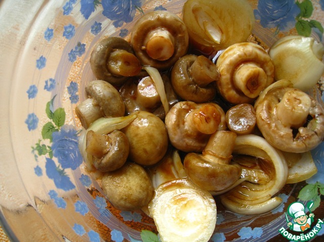 Отправить в маринад грибы и лук, оставить на 40 минут.