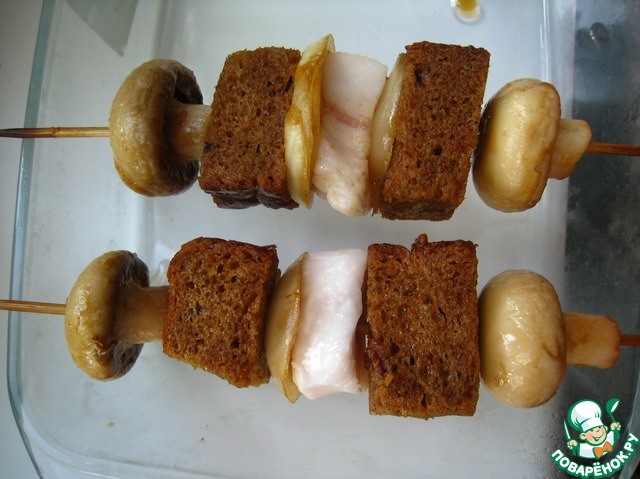 | Шашлык из украинского сала с грибами, луком и бородинским хлебом, замаринованными в соевом маринаде. |