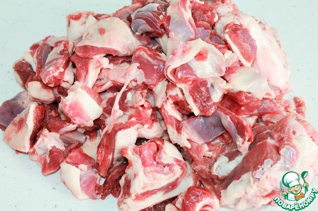 Баранину моем, обсушиваем и нарезаем небольшими кусочками. Я также добавила немного ребрышек. Можно использовать свинину или говядину.