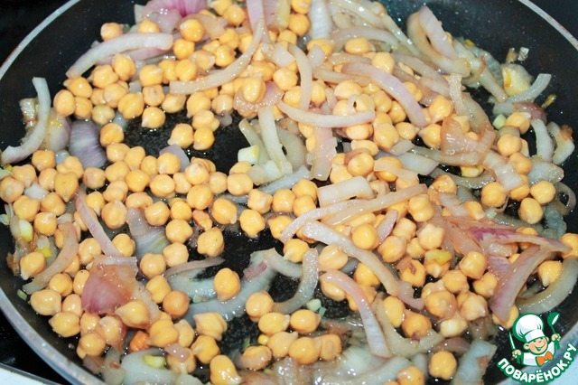 После чего перекладываем мясо и на этом же масле обжариваем лук и нут, до золотистости лука.