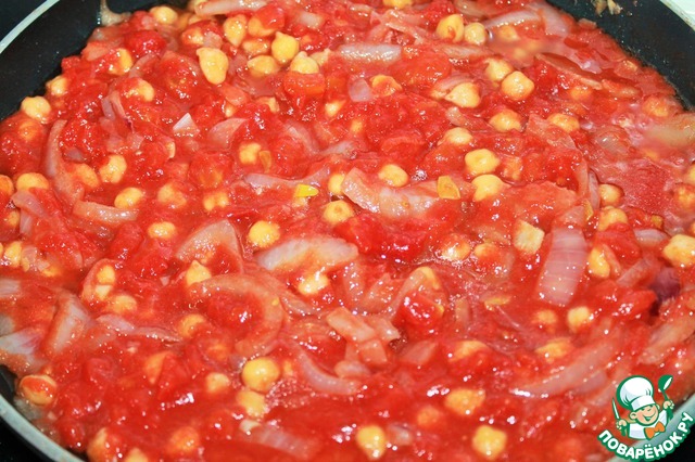 Добавляем томаты в собственном соку. Можно использовать свежие помидоры, предварительно сняв кожуру. На крайний случай томатную пасту, но вкус будет значительно отличаться.