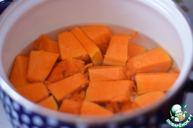 Далее приступаем к тыкве. Очищаем и режем на небольшие кубики. Отвариваем до готовности.