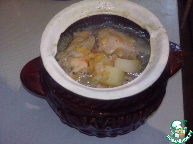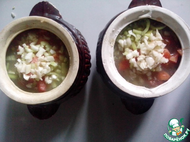 Распределяем овощи в горшочки. но - чеснок должен быть сверху всего!!. заливаем соком из кабачков. ВНИМАНИЕ!!! жидкость не должна быть под самые края горшочков. учтите что соус будет кипеть, и может расплескаться из под крышки. теперь добавляем соль, перец. можете также добавить специи по желанию. накрываем горшочки крышками и отправляем в духовку на 35-40 минут.