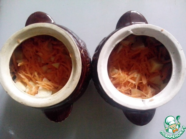 Раскладываем картофель, лук и морковь в горшочки. эти ингредиенты лучше перемешать
