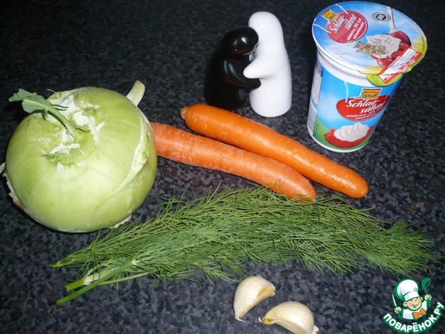 Кольраби, морковь нарезать кусочками! Укроп измельчить, чеснок пропустить через чеснокодавилку!
