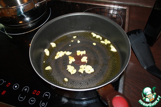 Чеснок нарезать дольками и обжарить на оливковом масле.