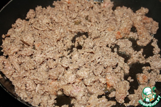 Фарш обжариваем до готовности, помешивая. Посолить и поперчить.