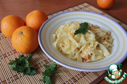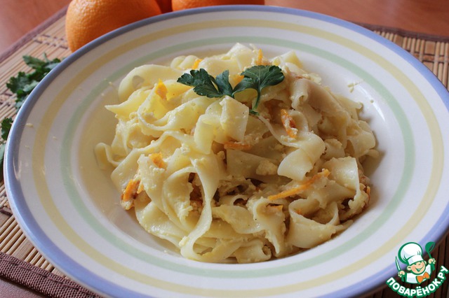 | Тальятелле, как и другая паста в Италии, является первым блюдом. В данном рецепте я предлагаю приобщиться к пасте с агруми, как называют итальянцы цитрусовые. Необычное сочетание и превосходный вкус. |