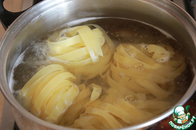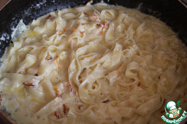 В большой, емкой сковороде соединяем тальятелле и наш соус. Оставляем на огне, помешивая, пока соус не загустеет