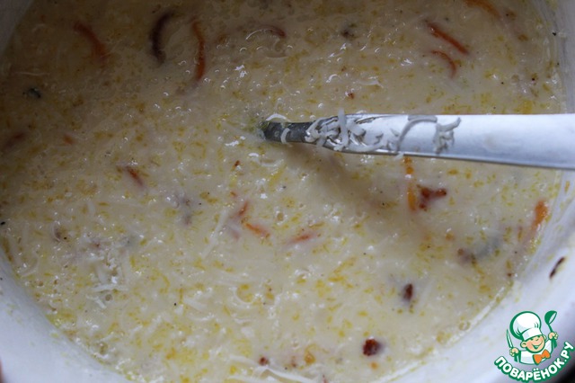 И сыр. Туда же кидаем наши специи. Взбиваем все до однородности (на сколько это возможно с сыром). И добавляем немного апельсинового сока, буквально пару раз сбрызнуть, чтобы появился дополнительный оттенок, но не очень яркий.