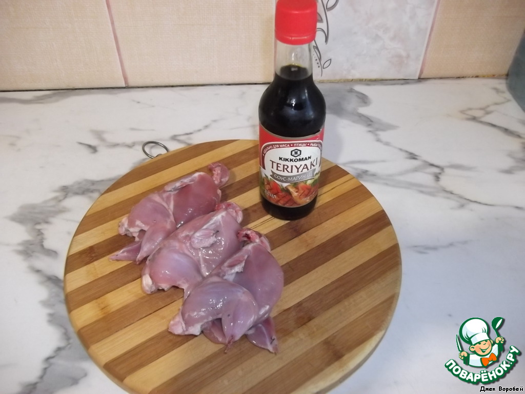 Берём тушки перепёлок. Тщательно обмываем, удаляем остатки перьев (если они есть). И соус "Терияки" kikkoman