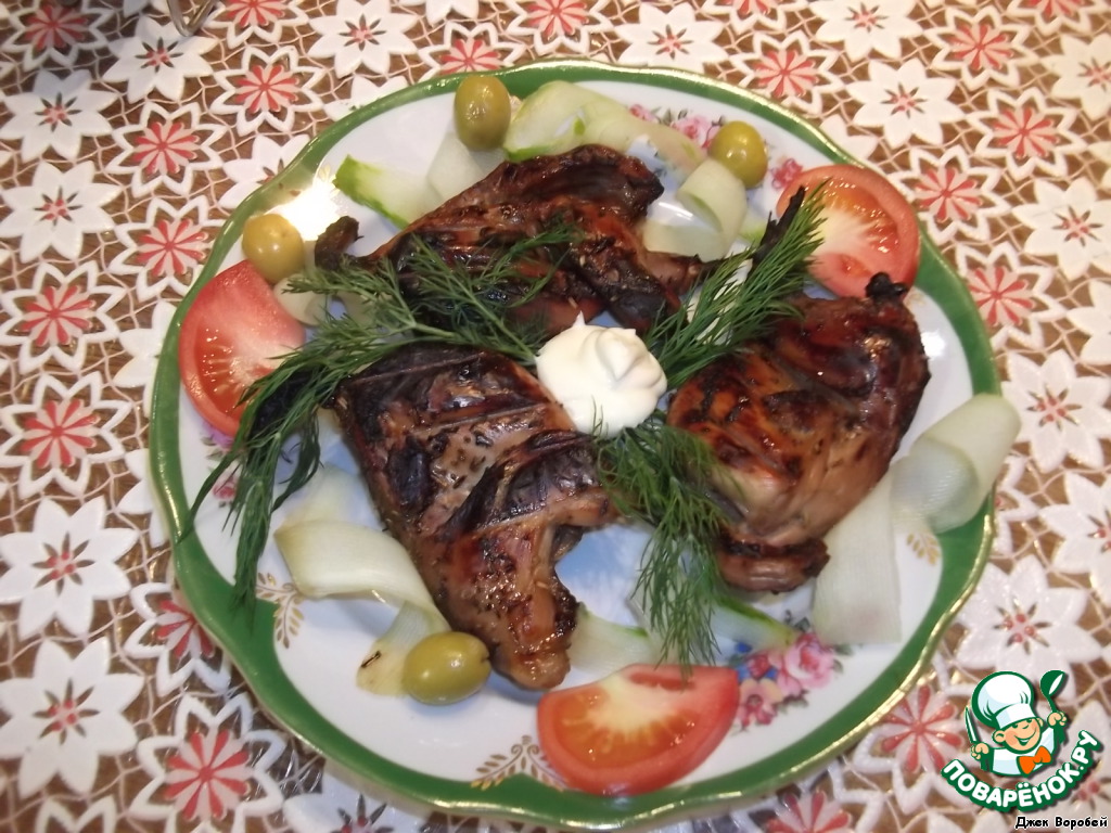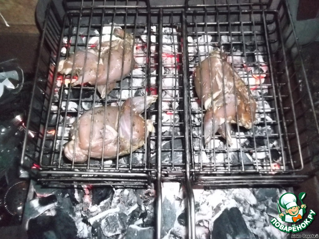 Промаринованные тушки укладываем на решётку и на угли. 10-15 минут достаточно, чтобы мясо приготовилось. Главное не забывать почаще переворачивать. Мясо нежное, быстро пригорает.