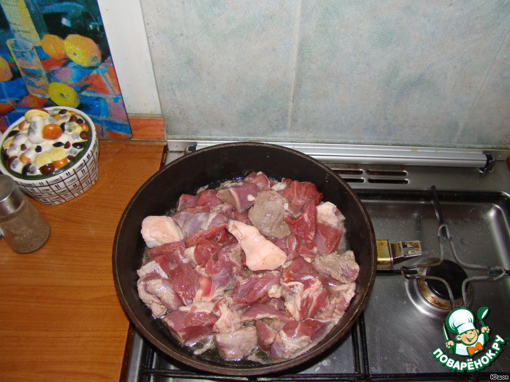 Обжарить мясо на сильном огне в течении 5 минут. Посолить и поперчить. Потом выложить баранину в другую посуду и поставить в теплое место.