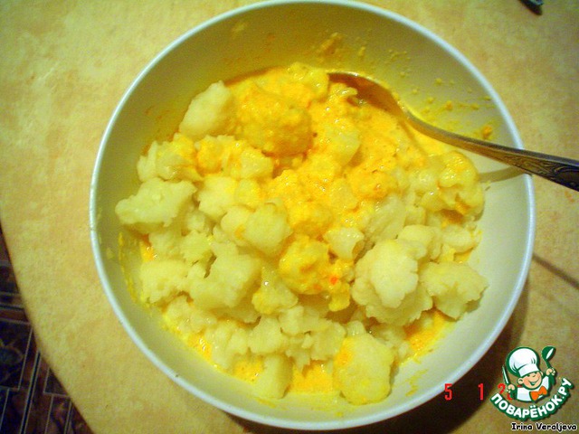 В эту массу выложить капусту и еще раз все перемешать так, чтобы все капустные цветочки покрылись заготовленной ярко-желтой смесью.