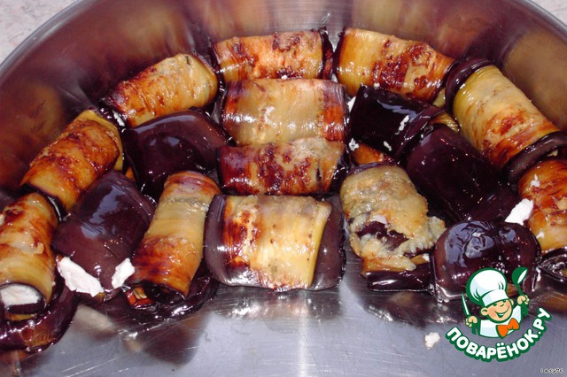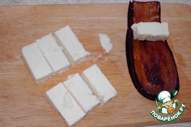 тем временем режем сыр на кирпичики и заворачиваем каждый кусочек феты в дольку баклажана