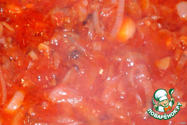 добавляем томатный соус или пасту, соль, перец, сахар, оставляем на огне минут 5-10.