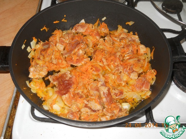 Обжариваем на сковороде лук до прозрачного состояния, добавляем к нему морковь, тушим минуту и туда же кладем грудку перемешиваем и оставляем томиться на маленьком огне под закрытой крышкой минут 5-7.
