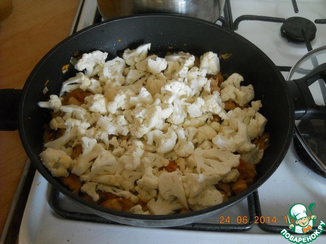 Разбирае капусту на соцветия или режем кусочками и закидываем ее в сковородку под крышку минут на 15-20, огонь можно прибавить, но немного.