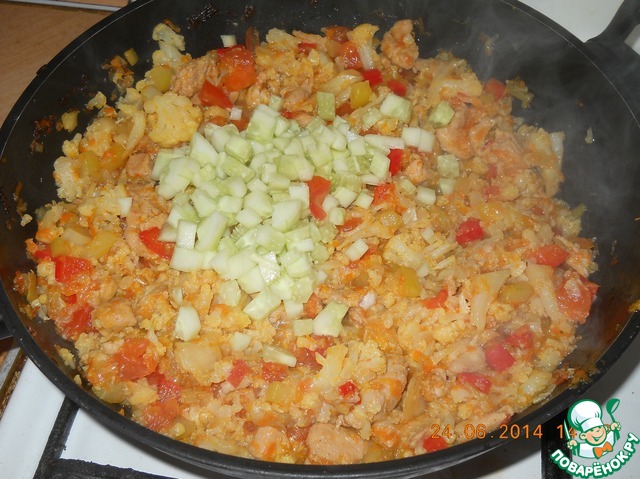 Пока наши овощи тушатся мы очищаем кабачок от кожицы, перчик болгарский освобождаем от серцевины, помидорчик опускаем на минуту в кипяток, а потом снимаем кожицу, после всех проведенных мероприятий режем овощи небольшими кубиками и отправляем в сковородку минут на 10.