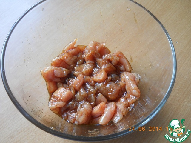 Грудку отбиваем, режем на небольшие кусочки складываем в посуду, добавляем специи по своему вкусу, соевый соус примерно две столовые ложки. Оставляем в сторонке на время.