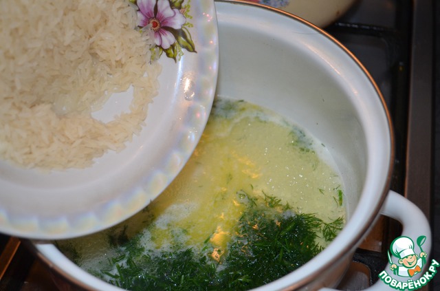 3. В кипящую подсоленную воду положить подготовленный укроп, топленное масло, засыпать промытый рис и варить при слабом кипении в закрытой посуде до готовности.