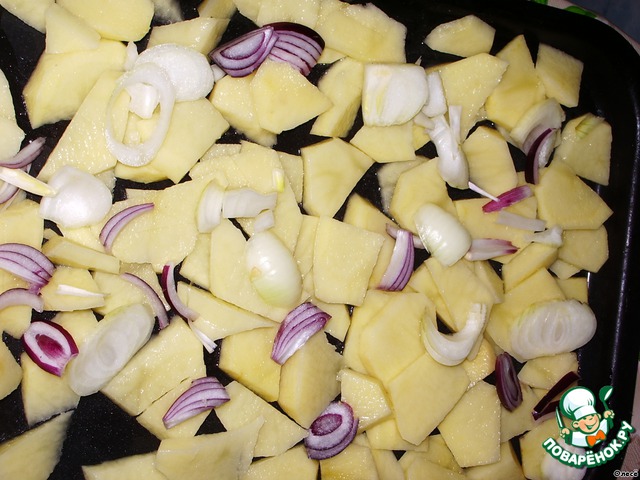 Когда рыба полежит - выложить её на картофель.Вино, в котором маиновалась рыбка, вылить на противень.