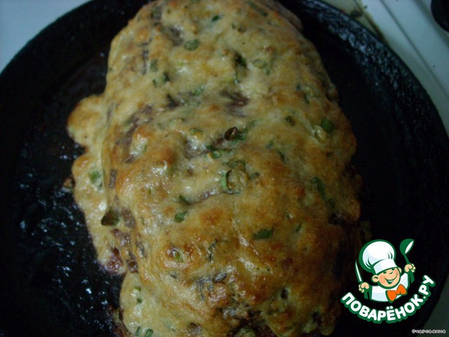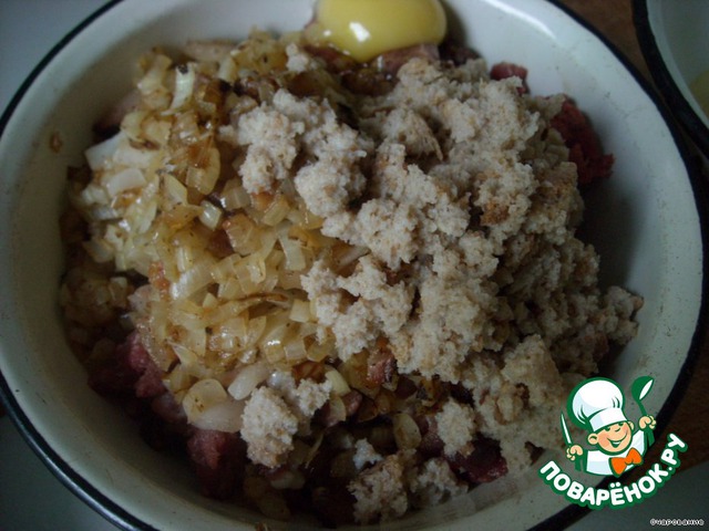 В фарш добавить хлеб, желтком, обжаренный лук, соль, перец, перемешать и сформовать батон, уложить в смазанную форму, запекать 30 минут. Затем вынуть и обмазать и
