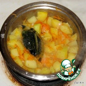 Добавляем небольшое количество воды, примерно 200 мл. Соль по вкусу. И ставим на небольшой огонь. Перемешиваем и готовим минут 25, пока картошка станет мягкой.