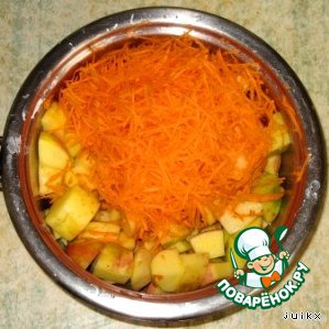 Морковь почистить и потереть на мелкой терке. Добавить к картошке.