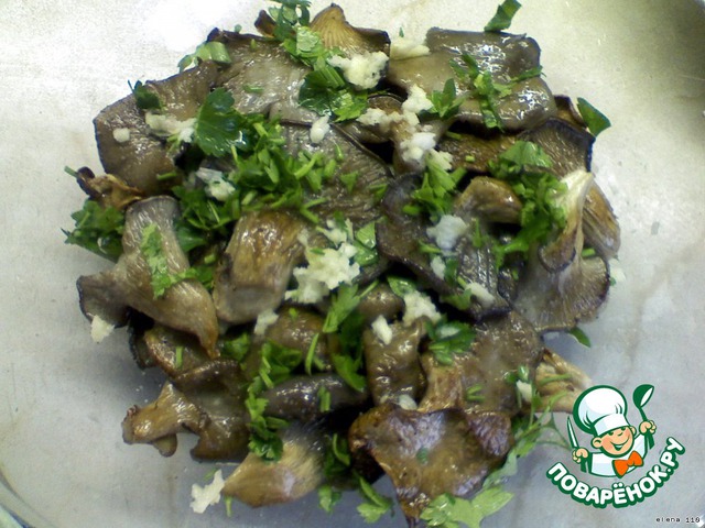 В миску выкладывать слоями: сначала грибы, посолить, поперчить. Затем посыпать грибы петрушкой.