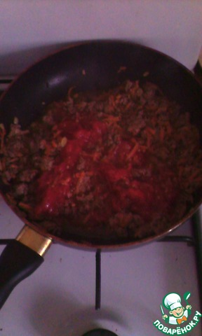 Лук обжарить, добавить морковь. Жарить примерно 5 минут. Добавить фарш, обжарить.