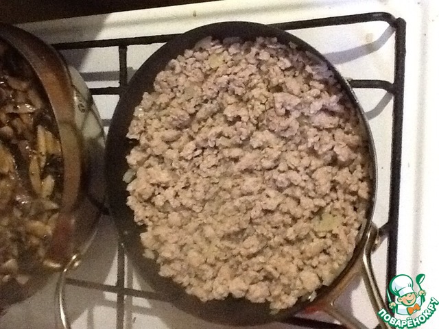 Обжарить фарш до того момента пока он выпустит сок, по желанию можно добавить репчатый лучок, посолить, по перчить!