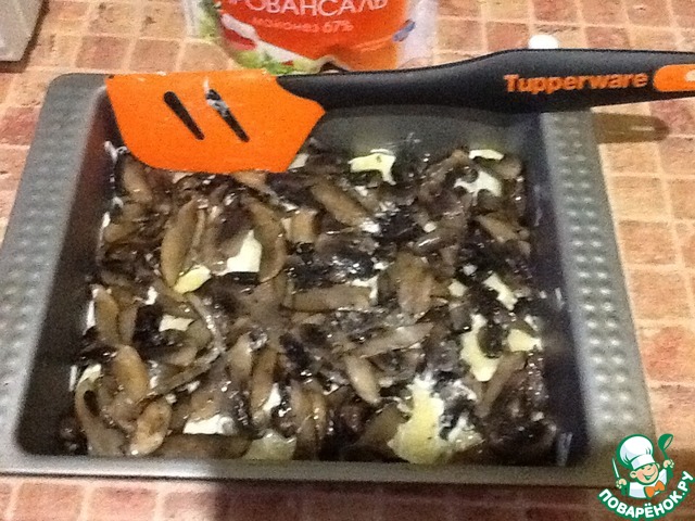 Выложить первым слоем на противень картофель, слегка полить рафинированным маслом, чуть посолить и перемешать! Добавить майонез