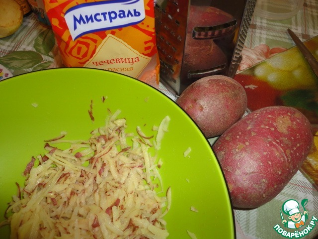 Картофель натереть на крупной тёрке. Сок не отжимать!!
