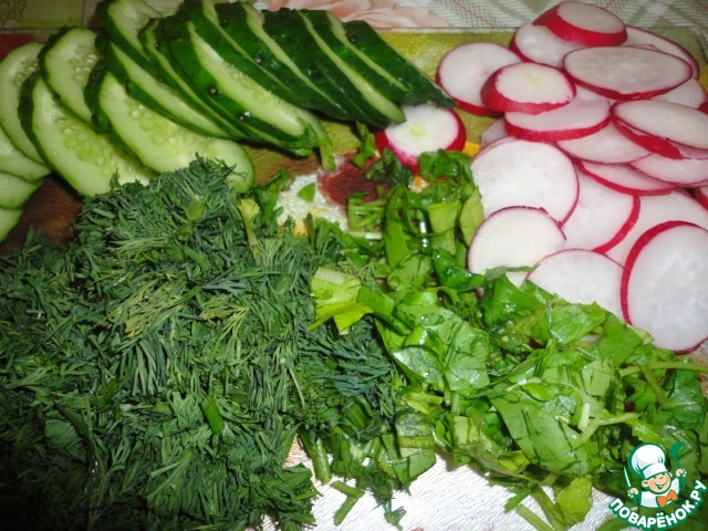 Огурцы, редис порезать кольцами. Мелко порубить зелень.